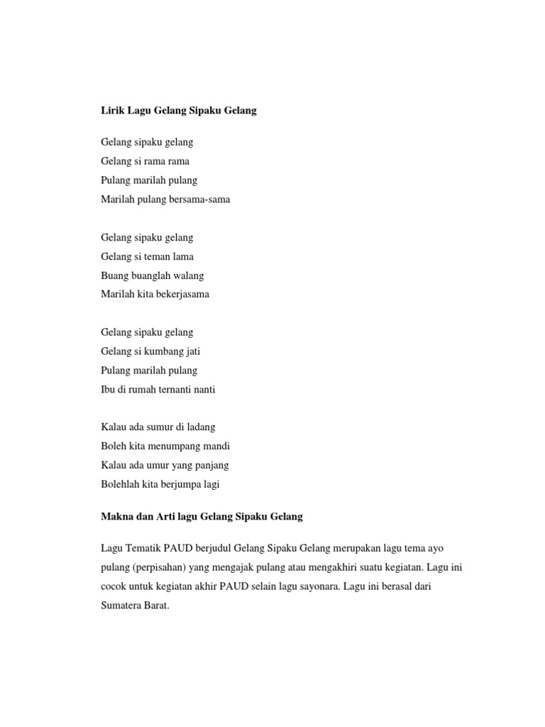 Lagu ini juga sudah tidak asing terdengar dinyanyikan oleh orang-orang luar Sumatera. 2m 5s Malay. Lagu anak yang berasal dari Sumatera Barat yang bertajuk Gelang Sipaku Gelang ini pastinya sudah tidak asing lagi untuk telinga kalian ya guys.